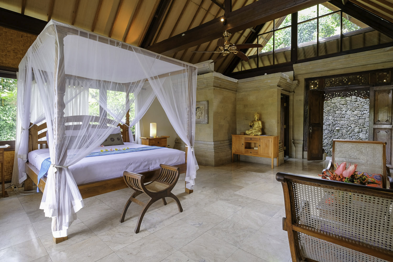 Sunrise Villa Ubud is a unique and charming retreat, bed & breakfast accommodation with breathtaking views overlooking the Campuhan valley, just minutes out of Ubud’s town centre. Step through the front gates and into lush tropical gardens, stone steps leading down to terraced gardens and private apartments. The lowest terrace offers a jungle infinity pool. Each room has it’s own entrance on separate terraces, with vista views overlooking gardens and the Campuhan Valley, a world of tranquility. The room is an open plan spacious one bedroom with private entrance, outdoor living area and a feel of old Bali. We are located just 3 minutes drive or 20 minutes walk outside of Ubud’s town centre, a town rich in culture, art and breathtaking landscapes. A quiet hideaway from the hustle and bustle of Ubud town centre.